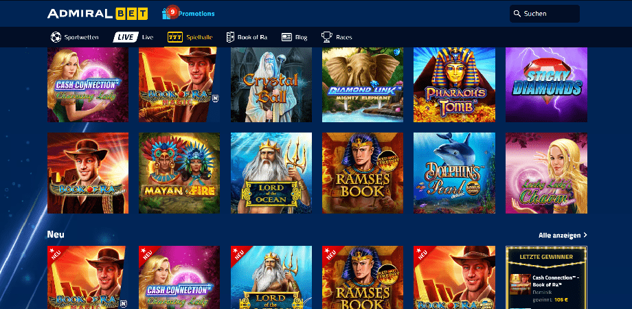 Admiral Casino bietet eine große Auswahl an Spielen, darunter Tischspiele, Spielautomaten, Live-Spiele und exklusive Spiele, um unterschiedlichen Spielvorlieben gerecht zu werden.