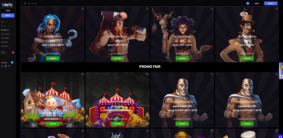 LootBox Light und LootBox Pro sind Boni, die registrierten Spielern jeden Montag zur Verfügung stehen. Die erste Option erfordert eine anfängliche Zahlung von 0,8 mBTC und belohnt Sie möglicherweise mit 25, 75 oder 100 Freispielen. Der zweite erfordert eine Mindesteinzahlung von 3 mBTC und gewährt entweder 150 Freispiele, 250 Freispiele oder einen 50 %-Bonus. Sie können jeden Mittwoch einen 50 %-Bonus von bis zu 1 mBTC und jeden Samstag und Sonntag 100 oder 200 Freispiele verdienen.