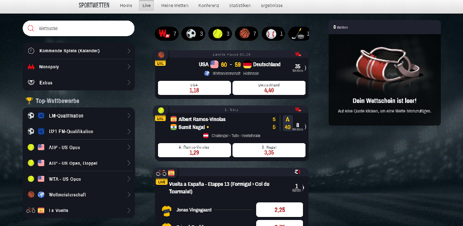 Benutzer von Winamax können Wetten auf eine Vielzahl von Sportereignissen platzieren. Fußball, Basketball, Motorradrennen, Baseball, Radfahren, American Football, Golf, Rugby, Snooker, Wintersport und Segeln sind inbegriffen. Winamax bietet im Vergleich zu anderen Buchmachern angemessene Quoten. Die Wettspanne beträgt beim Fußball 5,2 Prozent, beim Tennis 7,5 Prozent, beim Eishockey 7,6 Prozent, beim Basketball 5,6 Prozent und so weiter. Der Hausvorteil beträgt 6,5 Prozent. Die hier dargestellten Wettspannen basieren auf Quotenanalysen für eine Vielzahl von Wettbewerben in vielen Sportarten. Es ist wichtig zu bedenken, dass die Margen nicht nur von Sportart zu Sportart, sondern sogar von Liga zu Liga unterschiedlich sein können.