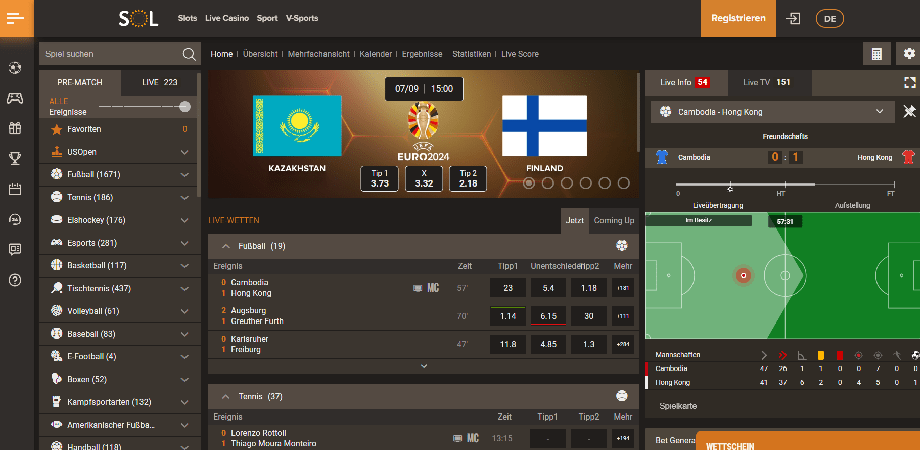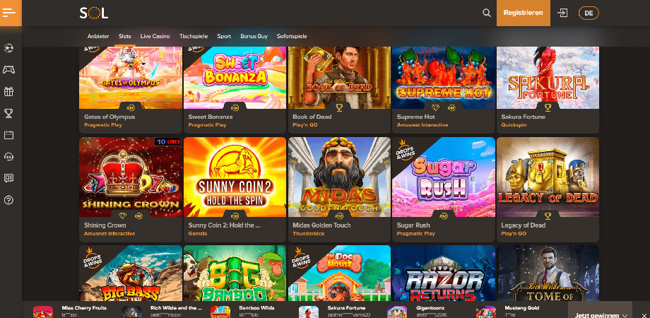 Sol Casino bietet eine große Auswahl an Glücksspieloptionen, darunter Spielautomaten, Tischspiele, Videopoker, Rubbellose, Live-Dealer-Spiele und In-Play-Sportwetten. Das Casino richtet sich in erster Linie an Russischsprachige, wie die Lobby mit Beschilderungen in Russisch und mehreren anderen Sprachen zeigt.