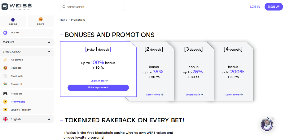 Joka tapauksessa rahapelilaitos tarjoaa oman kanta-asiakasohjelmansa, joka on nimetty WETF-tokeneiksi. Tilisi rahoitetaan aluksi 500 WETF-tunnuksella rekisteröinnin yhteydessä, ja 100 ylimääräistä on saatavilla KYC-vahvistuksen suorittamisen jälkeen ja 100 lisärahaa sähköpostin vahvistamisen jälkeen. Näillä tokeneilla on kaksi tarkoitusta: sekä "Pelaa ansaitaksesi" että "Pidä ansaita". Ensimmäistä käytettäessä rakeback maksetaan välittömästi WEFT-tokeneina panostesi kokonaissumman perusteella riippumatta siitä, voitatko vai häviätkö. Jälkimmäisen avulla voit ansaita korkoa tokeneillesi niiden arvon perusteella määrittämäsi ajanjakson aikana. Viimeisenä mutta ei vähäisimpänä, kun olet kerännyt vähintään 750 tokenia, voit myydä ne käteisellä. Saamasi summa perustuu alustan päivähintaan, joka oli 0,0015 $ yhdelle WEFT:lle tämän arvostelun kirjoituspäivänä.